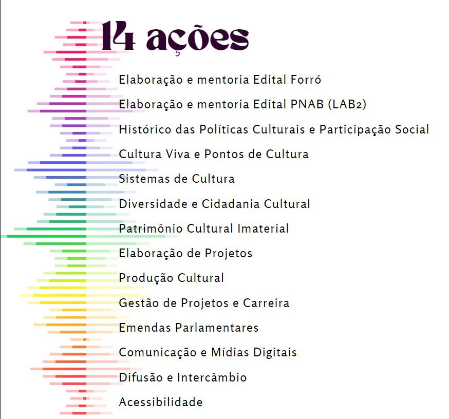 2º , o Curso tem 14 temas , cada um com oportunidade de fazê-los entender melhor como funciona o sistema público da cultura, através de suas leis, formas de financiamento e oportunidades de participação e estruturação dos fazeres culturais ligados à todo ecossistema do Forró, isto é professores , produtores , artistas e tantos outros;